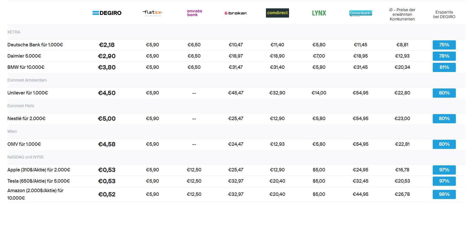 Auf dem Broker-Markt positioniert sich DEGIRO mit echten Kampfpreisen, was diesen Broker zum günstigsten im Vergleich zur Konkurrenz macht. Kostenbewusste Anleger dürften mit dem eng ausgelegten Finanzangebot sehr zufrieden sein. Alle Leistungen und Services, die über das Trading hinausgehen, kosten aber extra. Sparpläne fehlen bei DEGIRO. Jeder DEGIRO Trader darf einmal im Monat 200 ETFs kostenlos handeln (Siehe AGBs von Degiro). Liegt Ihr Volumen bei 1.000 Euro, können Sie diesen Vorzug öfter in Anspruch nehmen.