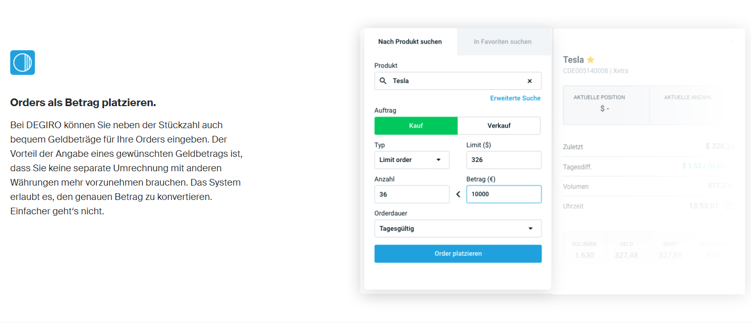 Sie entscheiden, wie viel Euro pro Order Sie beim Broker einsetzen. Dabei bietet DEGIRO ein Full-Service Dienstleistungspaket zu niedrigsten Gebühren. Beim Handel spielen die Sicherheit, die unkomplizierte Benutzung und die Übersicht eine Rolle pro Order. Es ist möglich, jeden Handel in Euro auszuführen, die Gebühren abzurufen und die Aktien zu jeder Tages- und Nachtzeit zu platzieren. Online behalten Sie die Überblick über alle laufenden und vergangenen Transaktionen, um entspannt zu handeln.