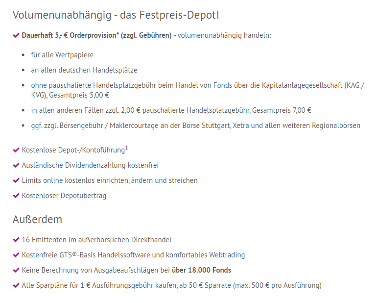 Je nach Jahresaktion bietet ein Festpreisdepot, die ersten ETF oder schon ab einer Provision von 0,00 Euro pro Kunde. Doch ist diese Aktion ist limitiert auf den außerbörslichen Limit und Direkthandel über die Baader Bank. Rufen Sie zu diesem Bereich bei Onvista noch das Ordervolumen ab, das liegt zumeist im dreistelligen Bereich wie zum Beispiel bei 1.000 Euro. Zudem finden Sie online über die Plattform der deutschen Handelsplätze die Liste der Produkte, auf die Sie mit dieser Aktion handeln können.