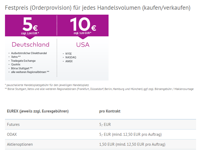 - Pauschale Ordergebühren: XETRA um ca. 7 Euro, US-Börsen um 15 Euro