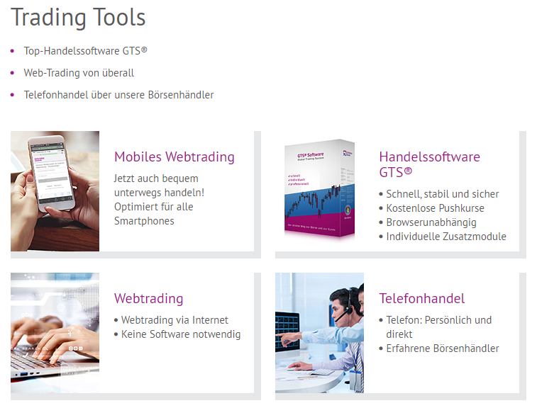 Sie können die Webseite entweder über das Smartphone oder direkt über den PC aufrufen. Die Onvista Bank verfügt über eine professionelle Handelssoftware GTS. Damit betreiben Sie browserunabhängigen Börsenhandel. Sie sind also nicht zwangsweise auf eine aktive Internetverbindung angewiesen. Zusätzlich integriert die Software ein Chart-Tool, das eine technische Analyse des Marktes erlaubt und Ihnen den Überblick und die Einschätzung der aktuellen Situation vereinfacht.