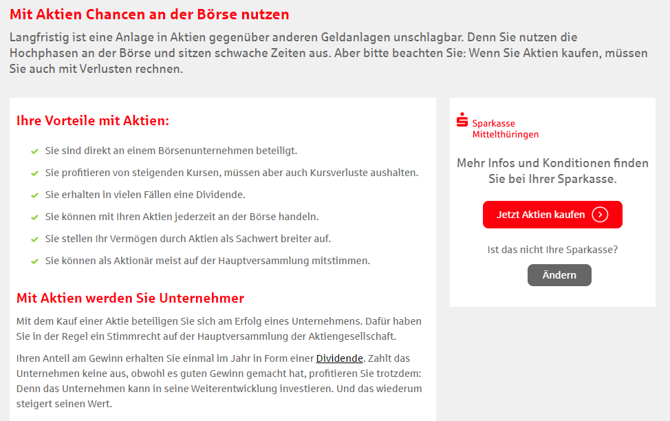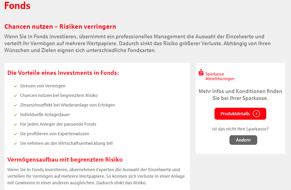 Die Sparkasse gehört deutschlandweit zu den bekanntesten Finanzgruppen und Banken Filialen. Deshalb stehen neben dem Konto und dem Handel mit online, ETF Sparplan an, CFDs und ETC auch weitere Finanzprodukte zur Auswahl. Wahlweise gibt es ein Wertpapierkredit, ein Währungskonto oder das Tagesgeldkonto sowie einen Auszahlplan. Letzteres ist das Gegenstück zum klassischen Sparplan. Hier haben die Händler die Möglichkeit, in regelmäßigen Abständen ihre Anteile aus dem Depot zu einem festgelegten Betrag zu verkaufen. Dieser Betrag steht Ihnen dann auf einem Konto zur Lebensführung zur Verfügung. Der Vorteil für den Händler: Je besser der Kurs ist, desto weniger der Anteile müssen aktive Trader verkaufen.
