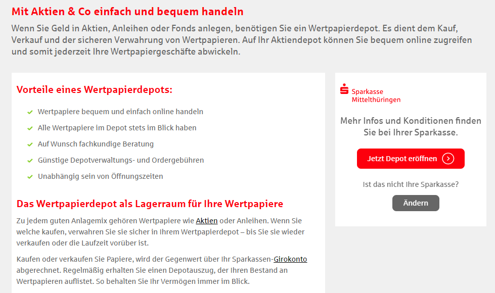 Mit einem Klick über die Webseite der Sparkasse eröffnen Sie das Depot bei der Sparkassen Finanzgruppe. Im besten Fall steuern Sie eine Sparkasse beziehungsweise eine Regionalkasse aus Ihrem Bezirk an.